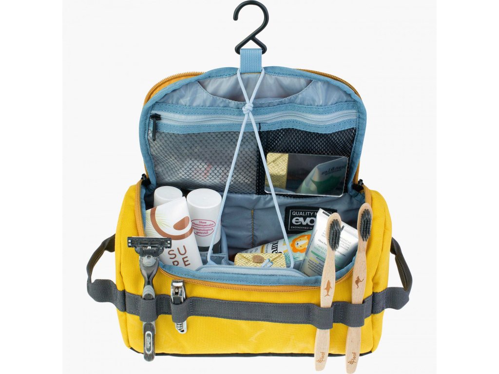 Cestovní kosmetická taška Evoc Wash Bag má 4 držáky na zubní kartáčky nebo holicí strojky. Speciální rukojeť umožňuje zavěšení. Odnímatelné zrcátko vám usnadní hygienické úkony.
